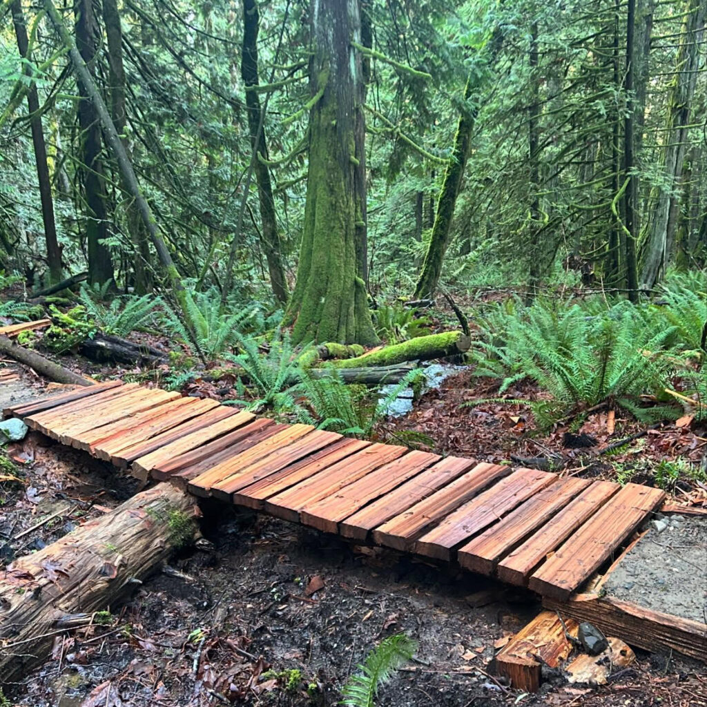 New bridges going up thanks to Kerry and friends! This functional art is not in the Community Forest but the cedar rungs were harvested there. This particular log was burnt decades ago and has been standing dead. Note the char and the tight grain. Old burnt cedar rungs are strong, grippy and rot resistant. The